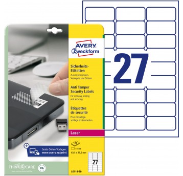 Etykiety zabezpieczające - plomby Avery Zweckform; A4, 20 ark./op., 63,5 x 29,6 mm, białe, poliestrowe