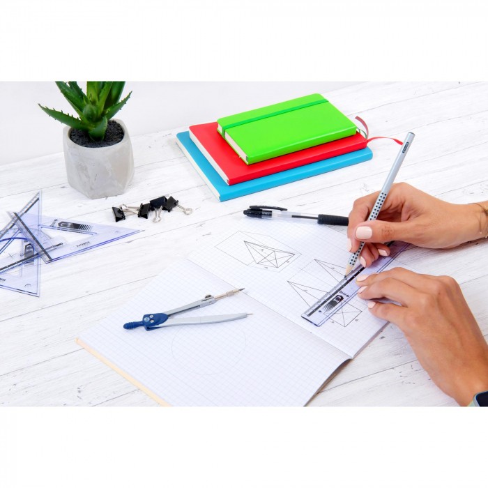 Zestaw kreślarski MemoBe by Pratel. Czteroelementowy szkolny zestaw kreślarski. W każdym zestawie 2 standardowe przezroczyste ekierki 16 cm 45/60 stopni, kątomierz 10 cm/180 stopni oraz linijka 16 cm.Elementy zestawu posiadają trwałą nieścieralną podziałkę i zaokrąglone rogi dla bezpieczeństwa użytkownika. Precyzyjny nadruk skali (do 0,001 cm). Wykonane z plastiku o odpowiednim stosunku twardości do elastyczności zapewniającym wysoką odporność na złamania. Pakowane w woreczki z zawieszką.