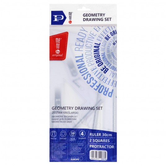 Zestaw kreślarski MemoBe by Pratel. Czteroelementowy szkolny zestaw kreślarski. W każdym zestawie 2 standardowe przezroczyste ekierki 16 cm 45/60 stopni, kątomierz 10 cm/180 stopni oraz linijka 30 cm.Elementy zestawu posiadają trwałą nieścieralną podziałkę i zaokrąglone rogi dla bezpieczeństwa użytkownika. Precyzyjny nadruk skali (do 0,001 cm). Wykonane z plastiku o odpowiednim stosunku twardości do elastyczności zapewniającym wysoką odporność na złamania. Pakowane w woreczki z zawieszką.