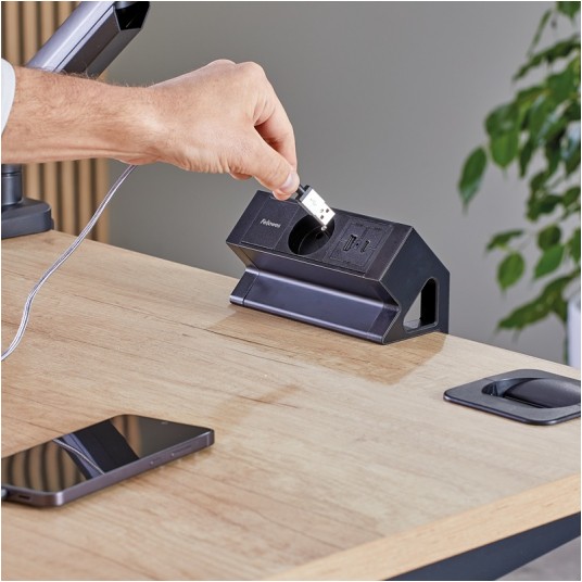 · Łatwo ładuj swoje urządzenia i utrzymuj stanowisko pracy w czystości oraz porządku dzięki łatwo dostępnemu nablatowemu modułowi zasilania do biurka.