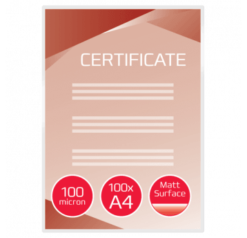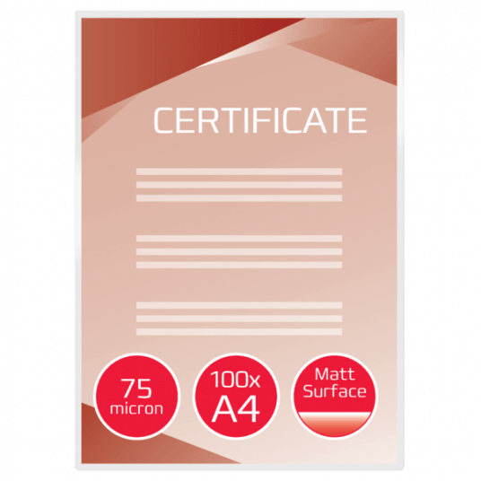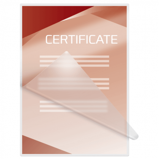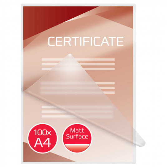 Wytrzymały matowy laminat przylegający do obu stron arkuszy chroni często używane dokumenty, minimalizuje odblaski i umożliwia pisanie po jego powierzchni. 2 x 75 mikronów. Format A4. Opakowanie 100 sztuk.