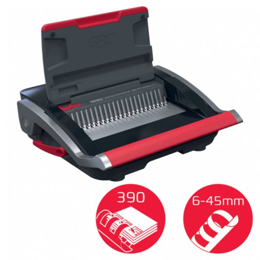 - Binduje do 390 kartek A5/A4 (80 g/m2) przy użyciu grzbietów o średnicy 45 mm