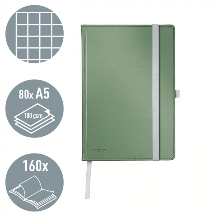 - Wysokiej jakości klasyczny notatnik w twardej oprawie, z nowoczesnym, przyjemnym w dotyku wykończeniem powierzchni okładki i elegancką kolorystyką.