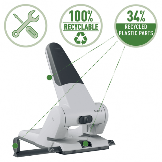 - Wysokiej jakości wzornictwo i materiały, możliwość naprawy przy pomocy części zamiennych, aby przedłużyć okres przydatności dziurkacza do użycia. Części zamienne: 51720000 Prowadnica i 51730000 Pojemnik na ścinki