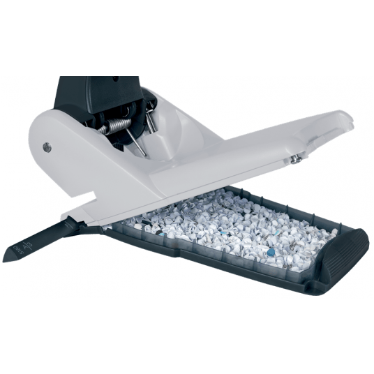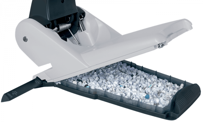 - Pojemnik na ścinki przymocowany jest na zawiasie, co ułatwia opróżnianie go, ogranicza bałagan i pozwala zaoszczędzić czas