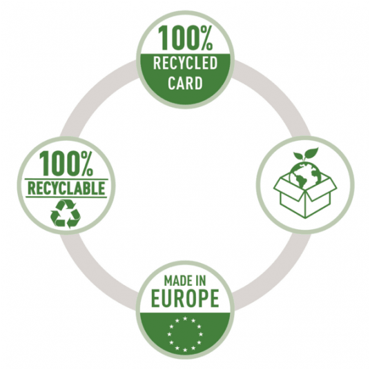 - Wykonany z kartonu w 100% pochodzącego z recyklingu, w 100% nadaje się do ponownego przetworzenia, posiada certyfikaty środowiskowe Blue Angel i FSC