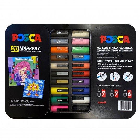 Odkryj nieograniczone możliwości artystyczne dzięki zestawowi 20 markerów POSCA, umieszczonych w eleganckim metalowym etui. Ten kompletny zestaw jest nie tylko praktycznym narzędziem dla artystów, ale także stanowi idealne wyposażenie dla każdego entuzjasty sztuki.