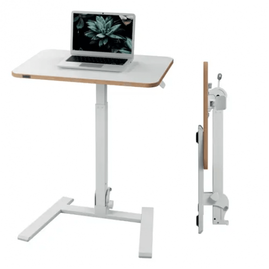 - Pomysłowo zaprojektowane ergonomiczne biurko pod laptopa do pracy w pozycji siedzącej i stojącej idealnie pasuje do małych przestrzeni. Umożliwia elastyczną i tymczasową pracę, a ponieważ można je złożyć do szerokości 16 cm, jest łatwe do przenoszenia i rozstawiania w dowolnym miejscu